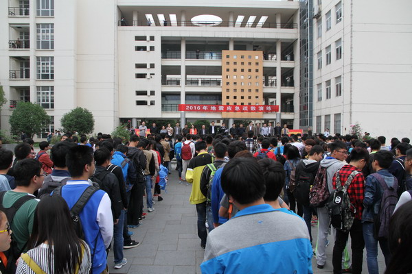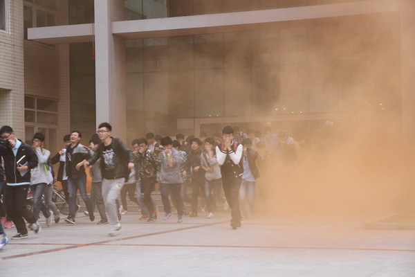 5月9日下午,北校区1、2号教学楼前广场,彩色烟雾笼罩,警报声鸣响,学子们迅速从教室跑出并向广场集合。这是学校2016年地震应急疏散演练的场面。