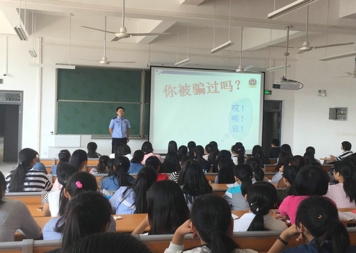 讲座中,苏磊民警以马斯洛的需求理论,阐述了安全的重要性,用真实案例论述了大学生安全状况并不理想的现实,他列举了利用手机以假换真、低价贱卖、抵押借款、短信诈骗、借骗银行卡号密码、网络诈骗、传销组织诈骗大学生的一个个真实的案例,以事实说话,配以幽默的讲解方式使全场笑声迭起,掌声不断。赵腾飞民警建议学生与家长留好辅导员、同学的电话,以防家长被骗,同时提醒学生“学生公寓、食堂、图书馆、运动场是校内的案件高发地,校外则是在车上和商场里”。犯罪分子常利用学生不锁门、不关门的疏忽性行为,趁学生洗漱、睡觉、上厕所不备之时顺手牵羊。赵腾飞告诫大家一定要养成随手关门的习惯,这样可以避免不必要的损失。王李瑞民警给大家介绍了毒品的危害,警示同学们珍爱生命,远离毒品。
