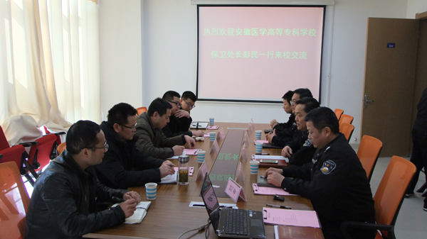 3月7日下午,安徽医学高等专科学校保卫处处长彭民一行4人来我校调研交流安全保卫工作。调研交流会由校保卫部部长方运纪主持。