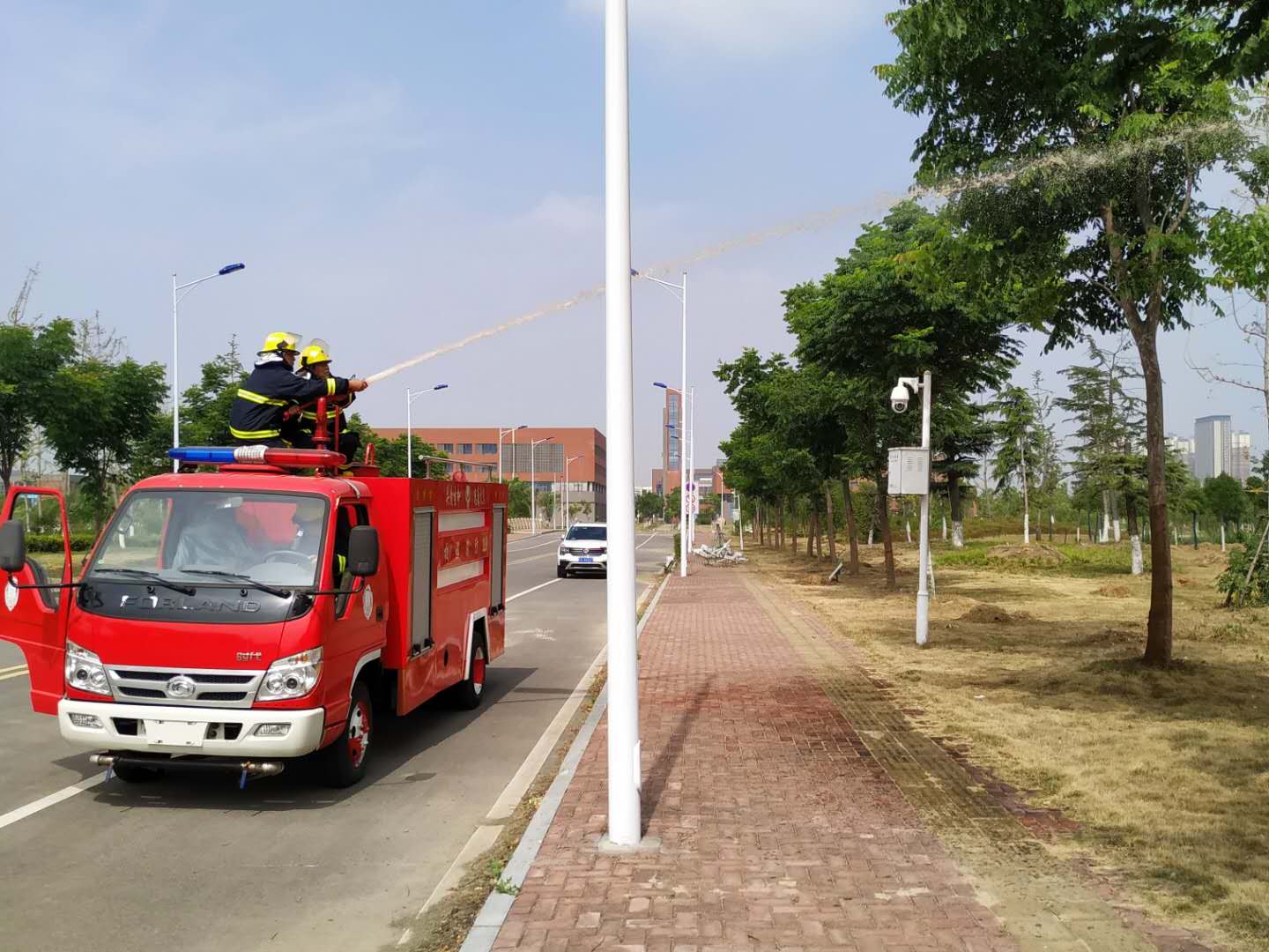 在开展各项消防安全专项检查的同时,保卫处还开展了以“提升基层应急能力,筑牢防灾减灾救灾的人民防线”为主题的线上安全教育及消防拉动演练活动。消防拉动演练以24小时值班组为单位,逐组进行消防拉动演练,让每一名参加值班的人员亲身体验快速穿灭火防护套装、操作消防车、甩水带等,全面提升队伍处置初起火灾的能力。