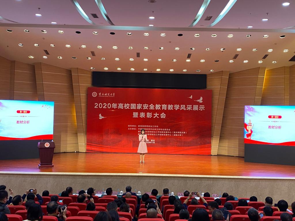 11月16日,由教育部思想政治工作司指导,中国高等教育学会保卫学专业委员会、教育部高校思想政治工作创新发展中心主办的2020年全国高校国家安全教育教学风采展示决赛在重庆师范大学圆满结束。经过激烈角逐,我校电气与信息工程学院教师丁玲玲脱颖而出,获得一等奖的佳绩。