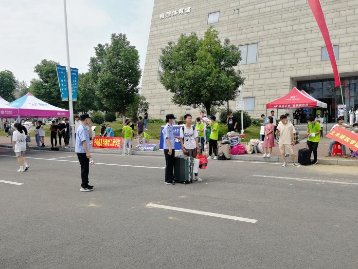 迎新期间,保卫处全体职工、保安人员、校卫队学生全部到岗,细心服务每一位师生,坚持做好秩序维护、新生报到引导、户口迁移、帮助学生搬运行李等工作。