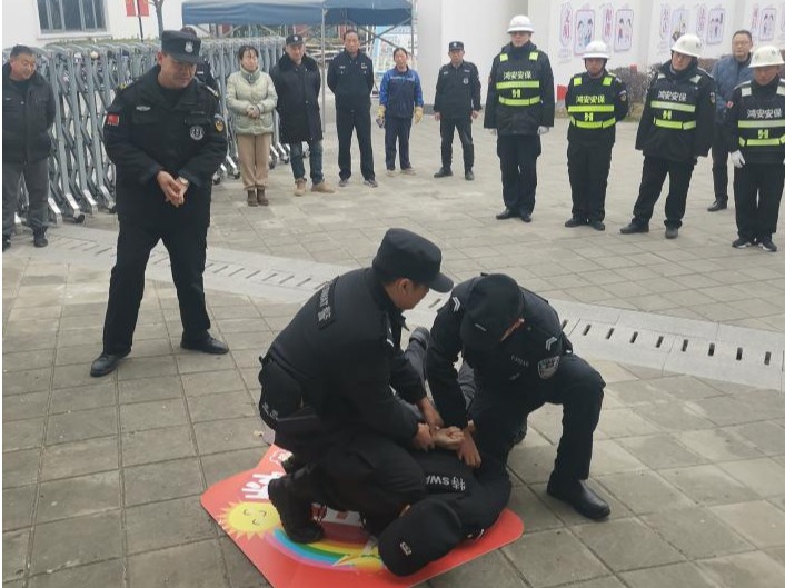 特警支队六大队队员孟宇详细讲解了警棍、盾牌、钢叉等警务装备的使用方法和注意事项,现场演示了战术队形变化、三人作战协同等战术方法,传授了可疑人员及危险行为有效识别、先发制人处置突发暴力行为等常规技巧,并指导附属小学、幼儿园安保人员进行了模拟实战演练。
