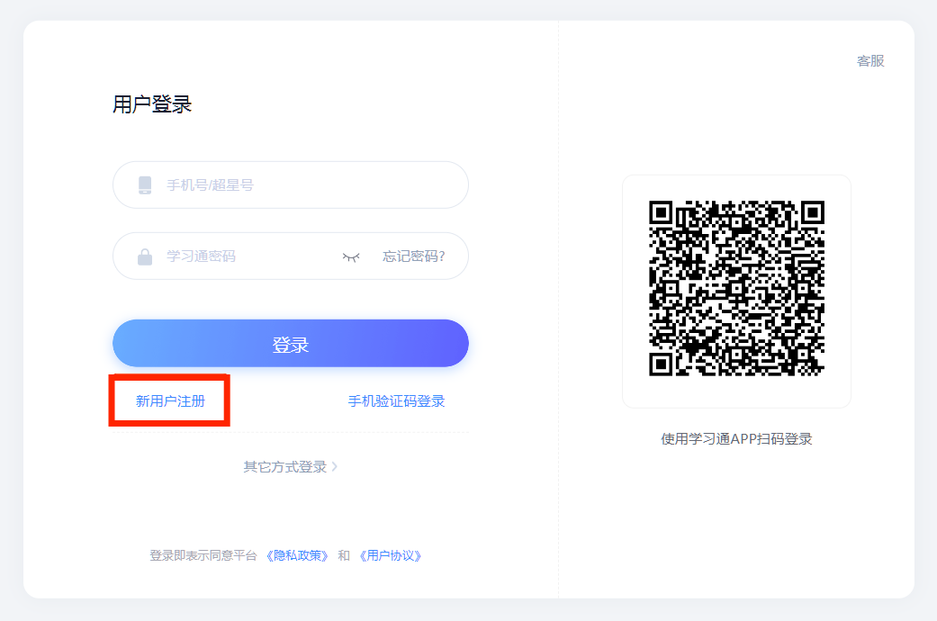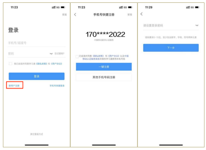 2.打开“学习通”App,点击“新用户注册”,用手机号及验证码注册,并完成密码设置。