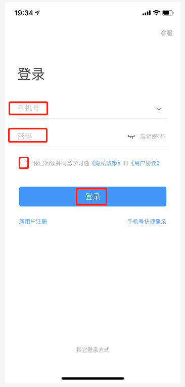 4.注册后,若需再次登录,可直接输入手机号和设置好的登录密码,阅读完成并同意用户协议后,便可勾选,点击登录即可。
