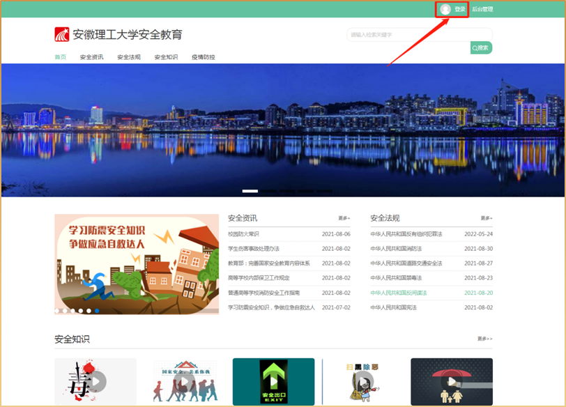 1.打开安徽理工大学安全教育平台(http://ahlg.aqjy.chaoxing.com),在首页右上角选择“登录”进入用户界面。