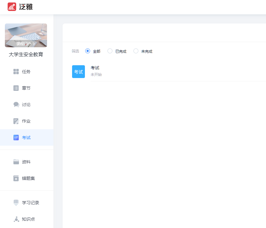 在课程页面,点击“章节”、“作业/考试”、“考试”,即可选择参加相应的考试项目。