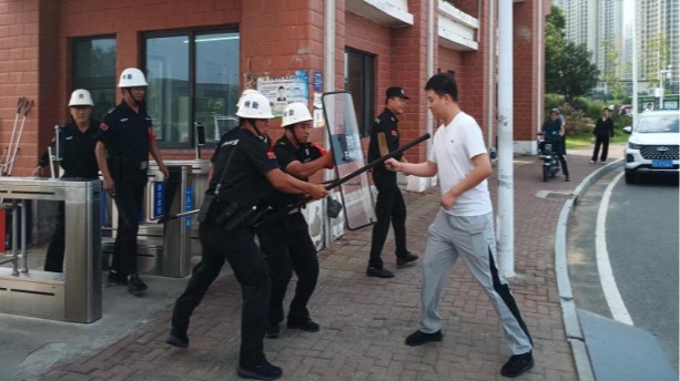 现场模拟演练“持刀暴徒”意图闯入校园,安保人员与民警默契配合手持安防器械与其对峙,运用防暴盾牌、防暴钢叉,迅速制服“持刀暴徒”,演练活动圆满结束。