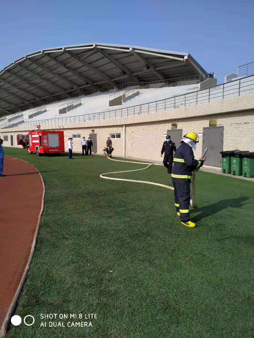 5月7日,保卫处联合后勤保障处在至诚体育场举行学校防疫物资仓库灭火救援实战演练。