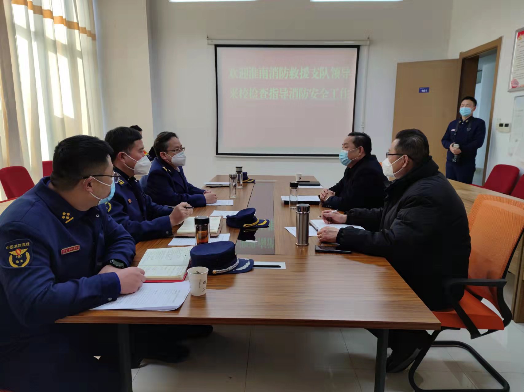 1月4日下午,淮南市消防救援支队支队长宋群立一行来我校检查指导消防安全工作。校保卫处处长方运纪主持汇报会。
